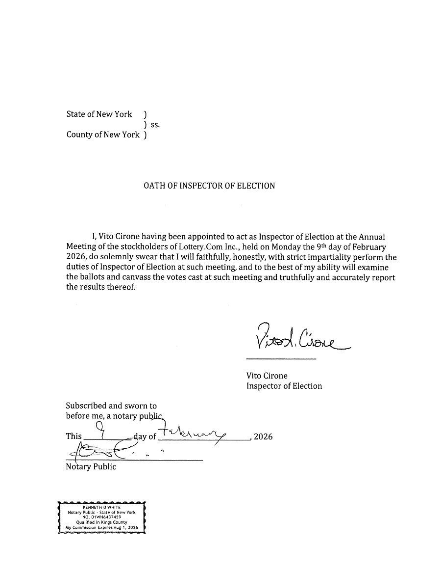 Proposal 1: PROPOSAL WITHDRAWN – NO VOTE REQUIRED. The proposal to amend the Company’s Articles of Incorporation (as previously amended and restated) for the purpose of restating the Certificate of Incorporation to change the Company’s name from “Lottery.com Inc.” to “Sports Entertainment Gaming Global Corporation” has been withdrawn. Pursuant to Sections 242 (a)(1) and (d)(1) of Delaware General Corporation Law, no meeting or vote of shareholders is required to adopt a change of the corporation’s name. Accordingly, on January 27, 2026, the Company filed its application with the Delaware Division of Corporations to officially change its name to Sports Entertainment Gaming Global Corporation. The Delaware Division of Corporations accepted the application for name change and the Company’s legal name was changed as described herein, effective as of January 27, 2026.
